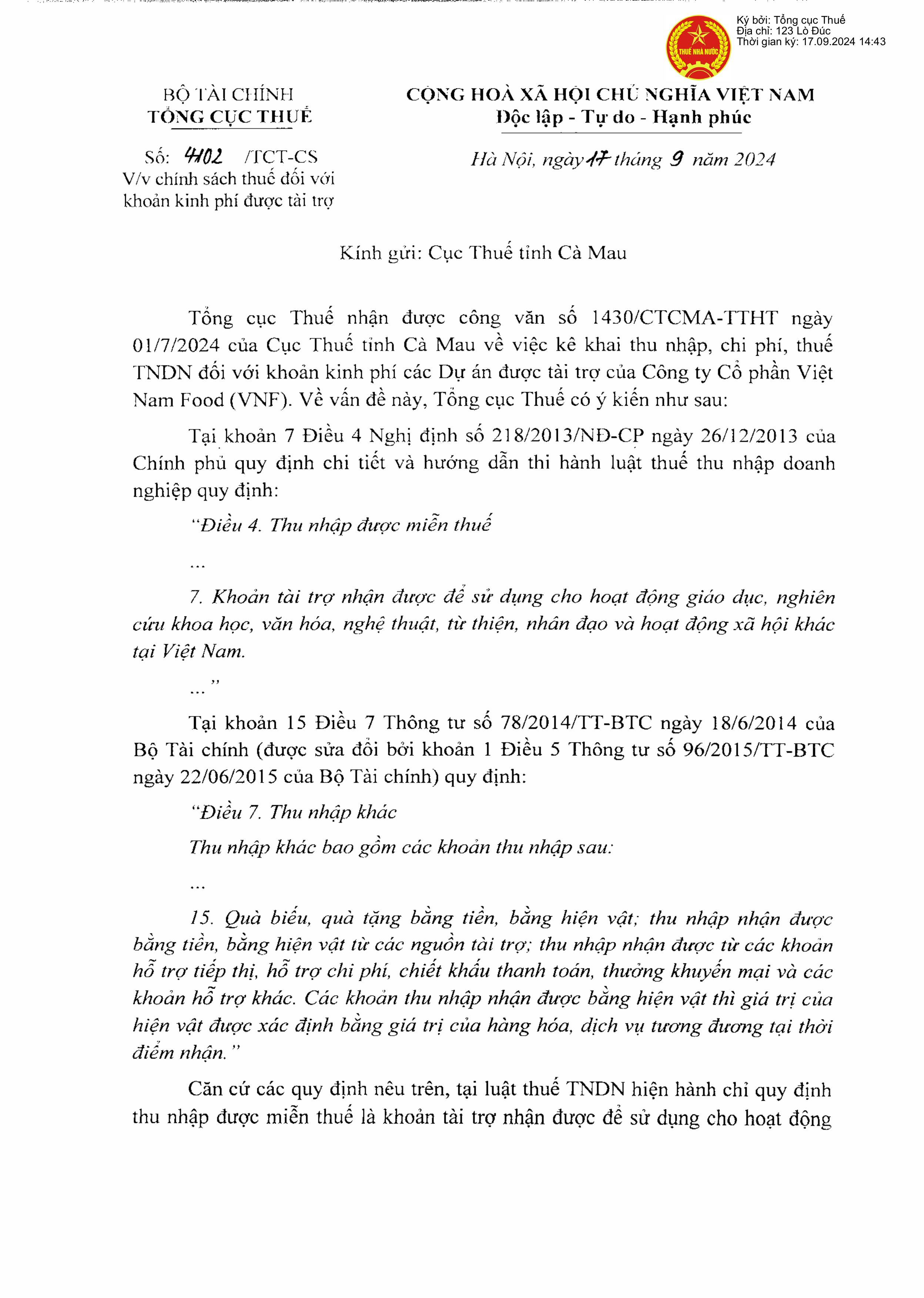 CV 4102/TCT ngày 17.9.2024 v/v thuế TNDN của khoản kinh phí nhận tài trợ